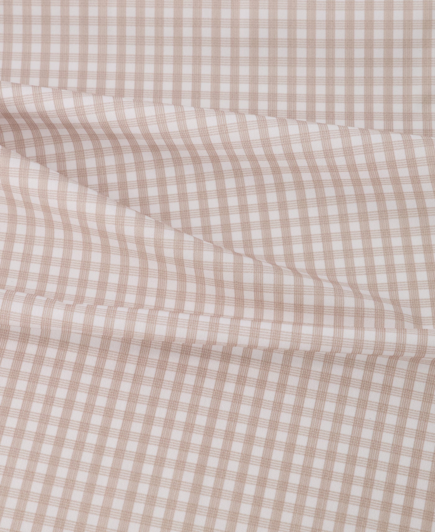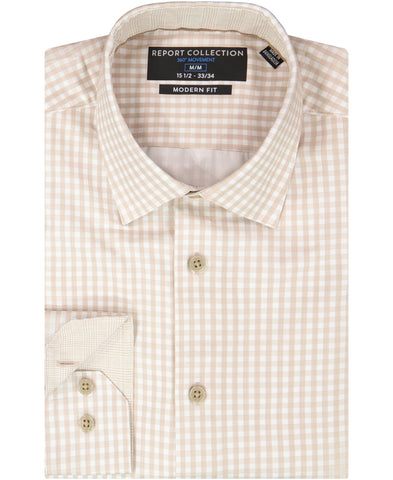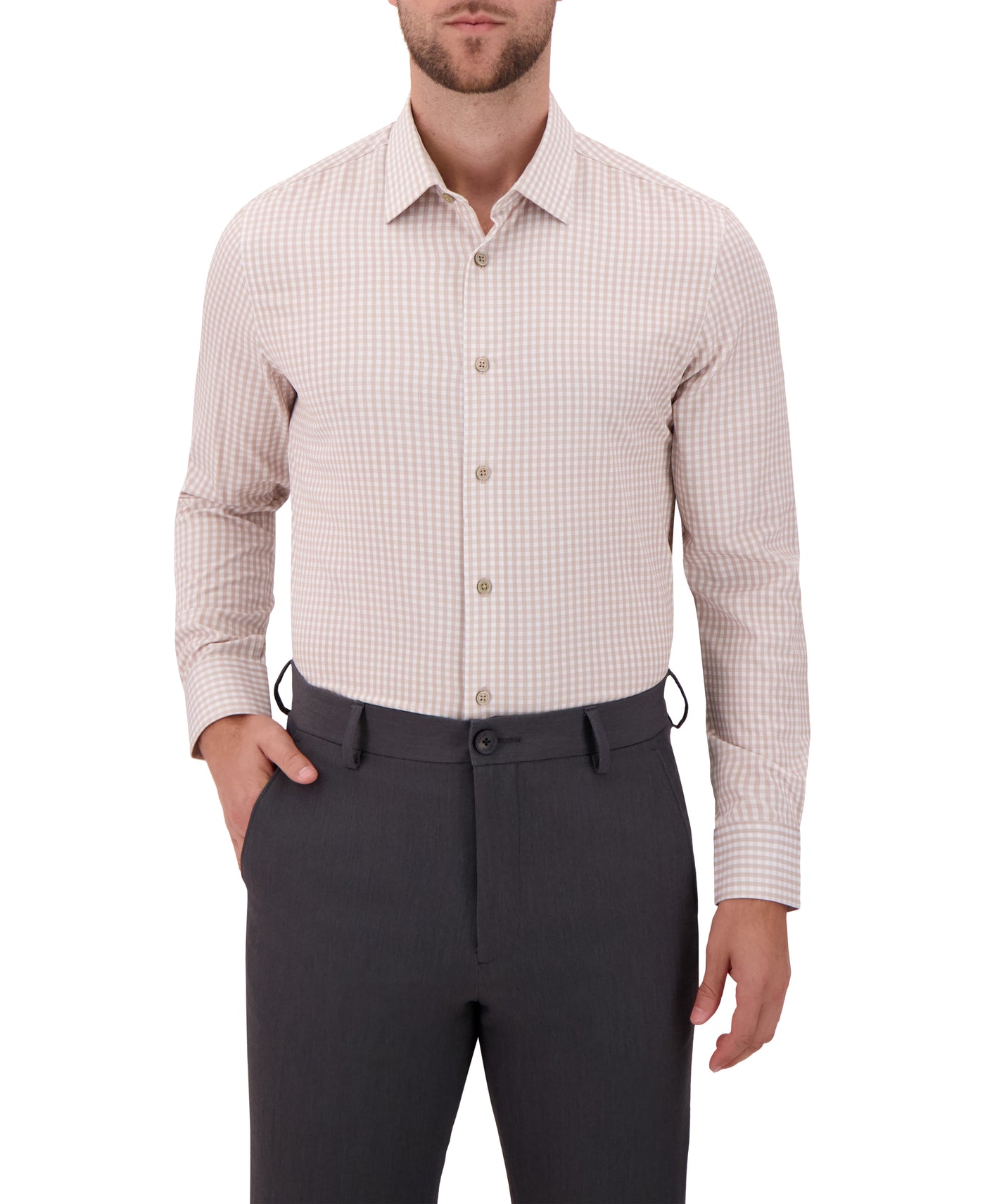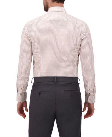 This men’s long sleeve dress shirt features a refined check print woven into a soft neutral-toned base, offering a polished look that transitions seamlessly from business settings to smart casual occasions. Designed with a pointed collar, long sleeves with buttoned cuffs, and a full button-front placket, it delivers a clean, tailored appearance. The 4-way stretch woven fabric allows flexible movement while maintaining a crisp, structured finish. A modern fit ensures a sharp silhouette whether worn tucked or untucked.