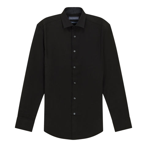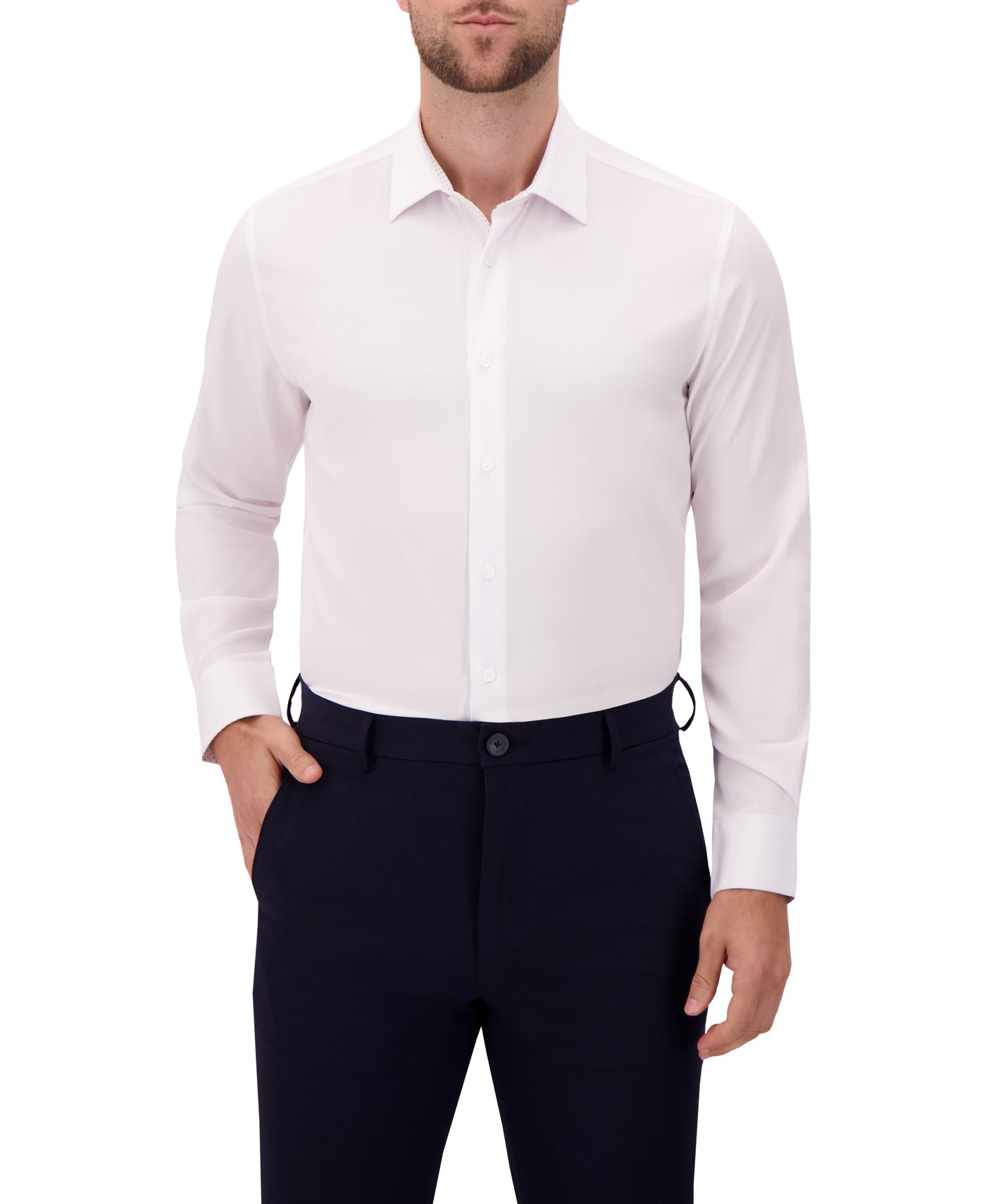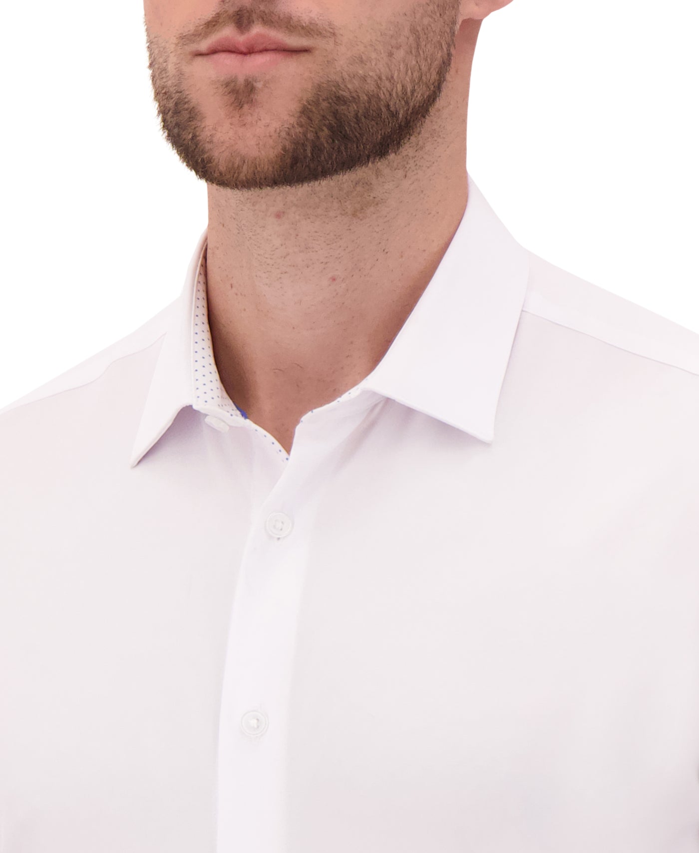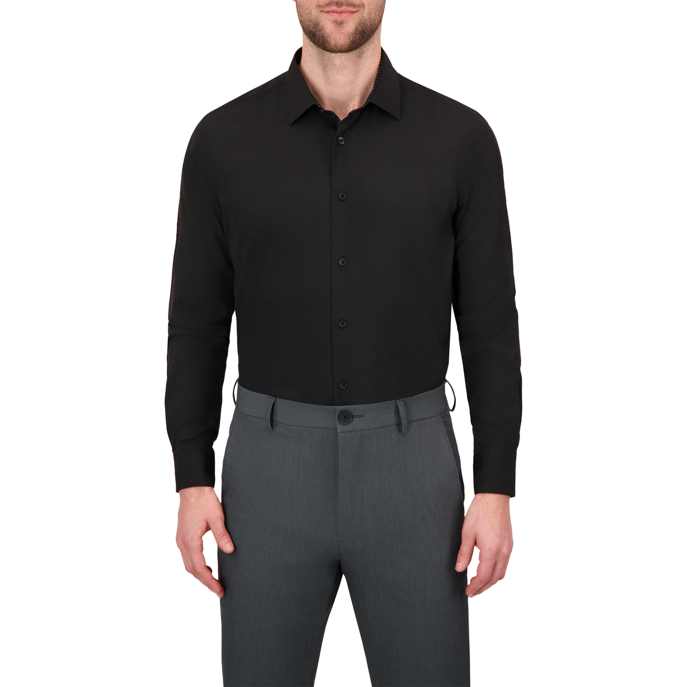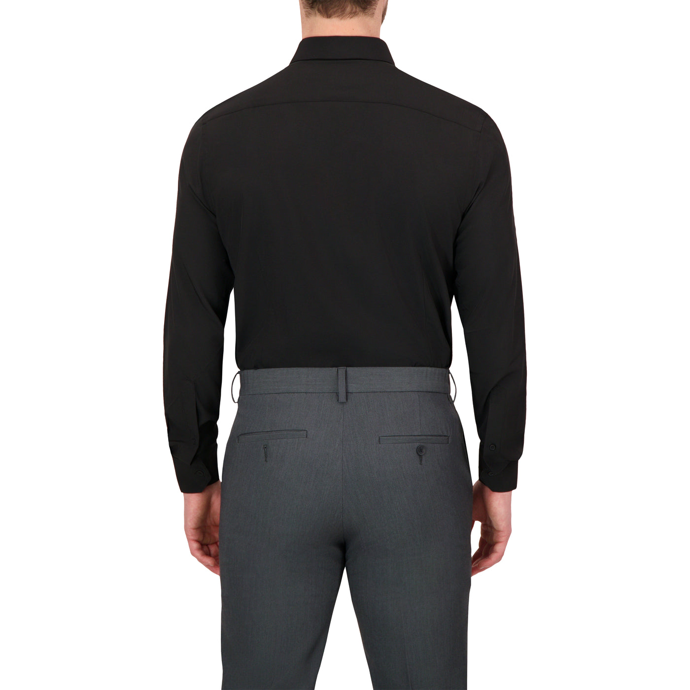 This men’s long sleeve dress shirt is crafted from a smooth solid woven fabric designed for flexibility, structure, and everyday wear. Featuring a pointed collar, long sleeves with buttoned cuffs, and a full button-front placket, it delivers a clean, polished appearance suitable for work or formal occasions. The 4-way stretch construction allows ease of movement while maintaining a sharp silhouette. Designed to be worn tucked or untucked, this shirt balances modern comfort with timeless style.