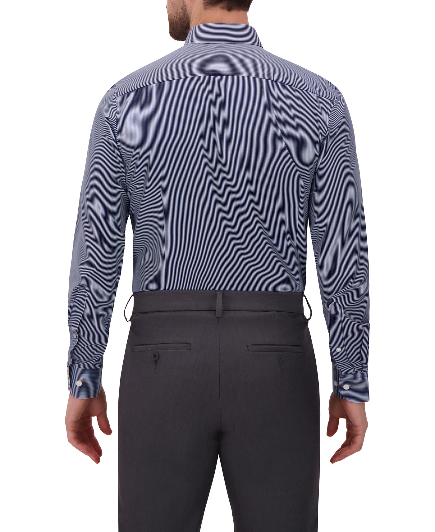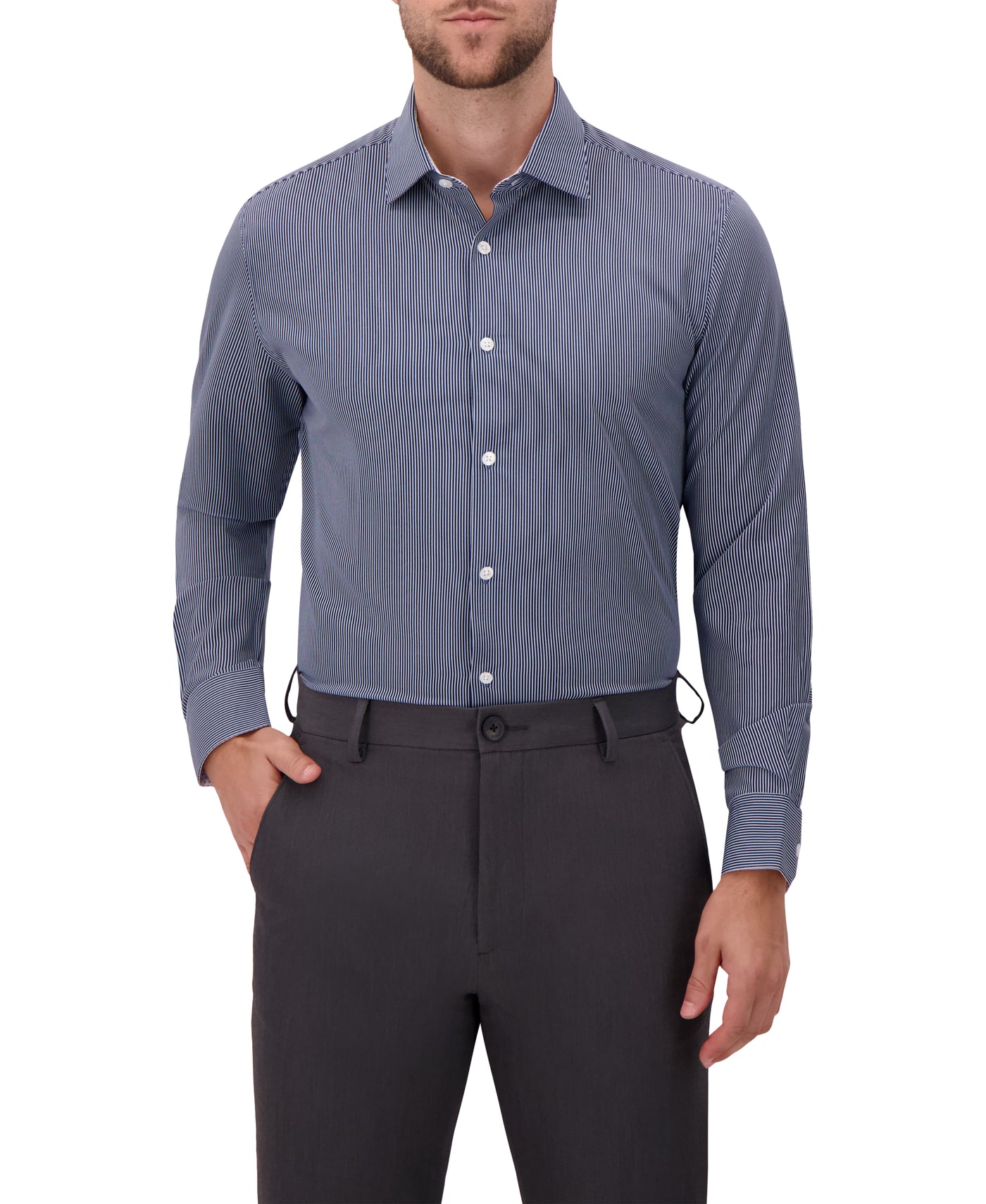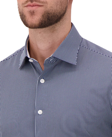 This men’s long sleeve dress shirt features a crisp vertical stripe print that delivers a sharp, elongated look suitable for both professional and elevated everyday wear. Designed with a pointed collar, long sleeves with buttoned cuffs, and a full button-front closure, it creates a clean, tailored silhouette. The 4-way stretch woven fabric offers superior flexibility and comfort while maintaining a smooth, structured finish throughout the day. A modern fit ensures a polished appearance whether worn tucked in for work or styled more casually.