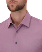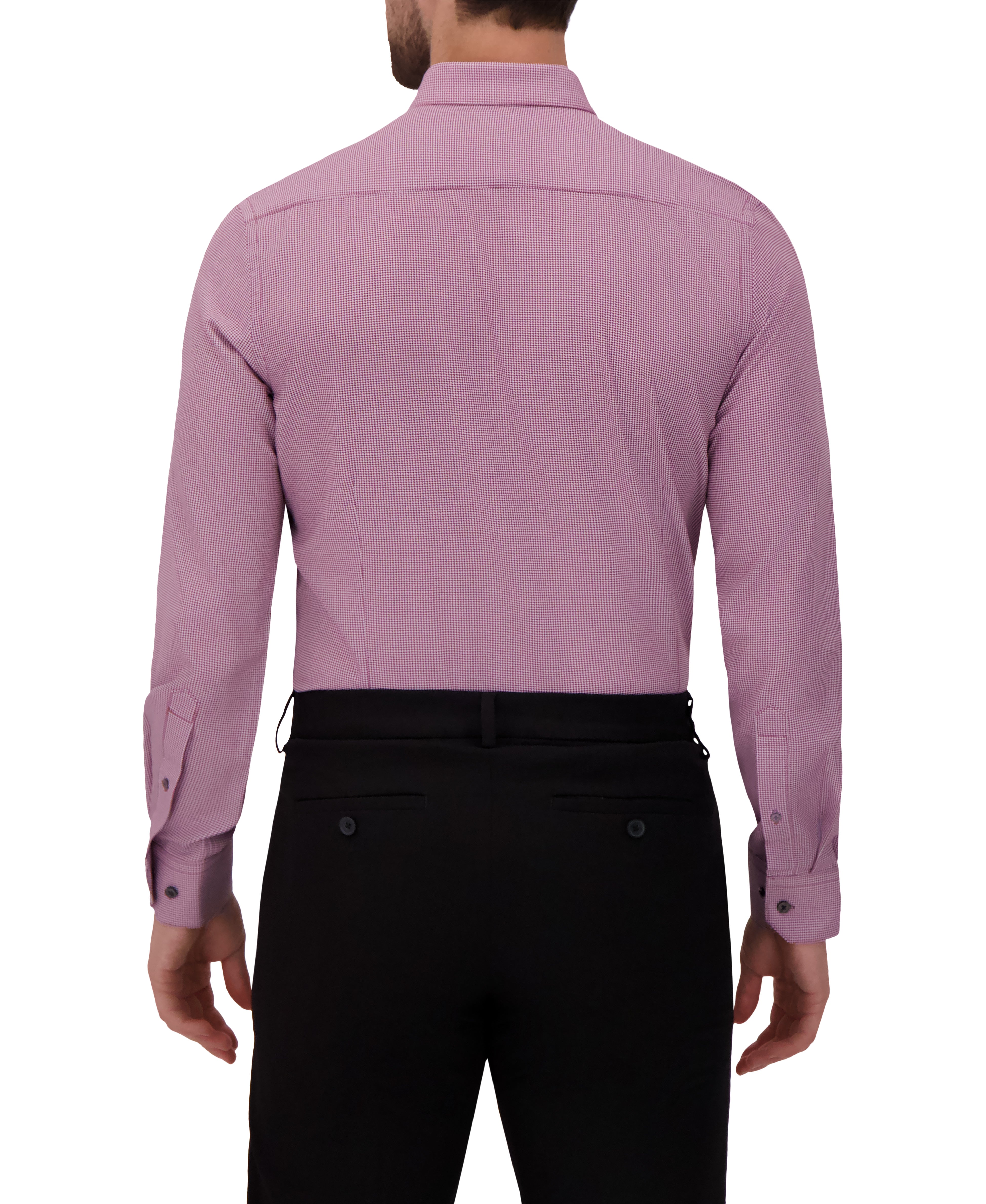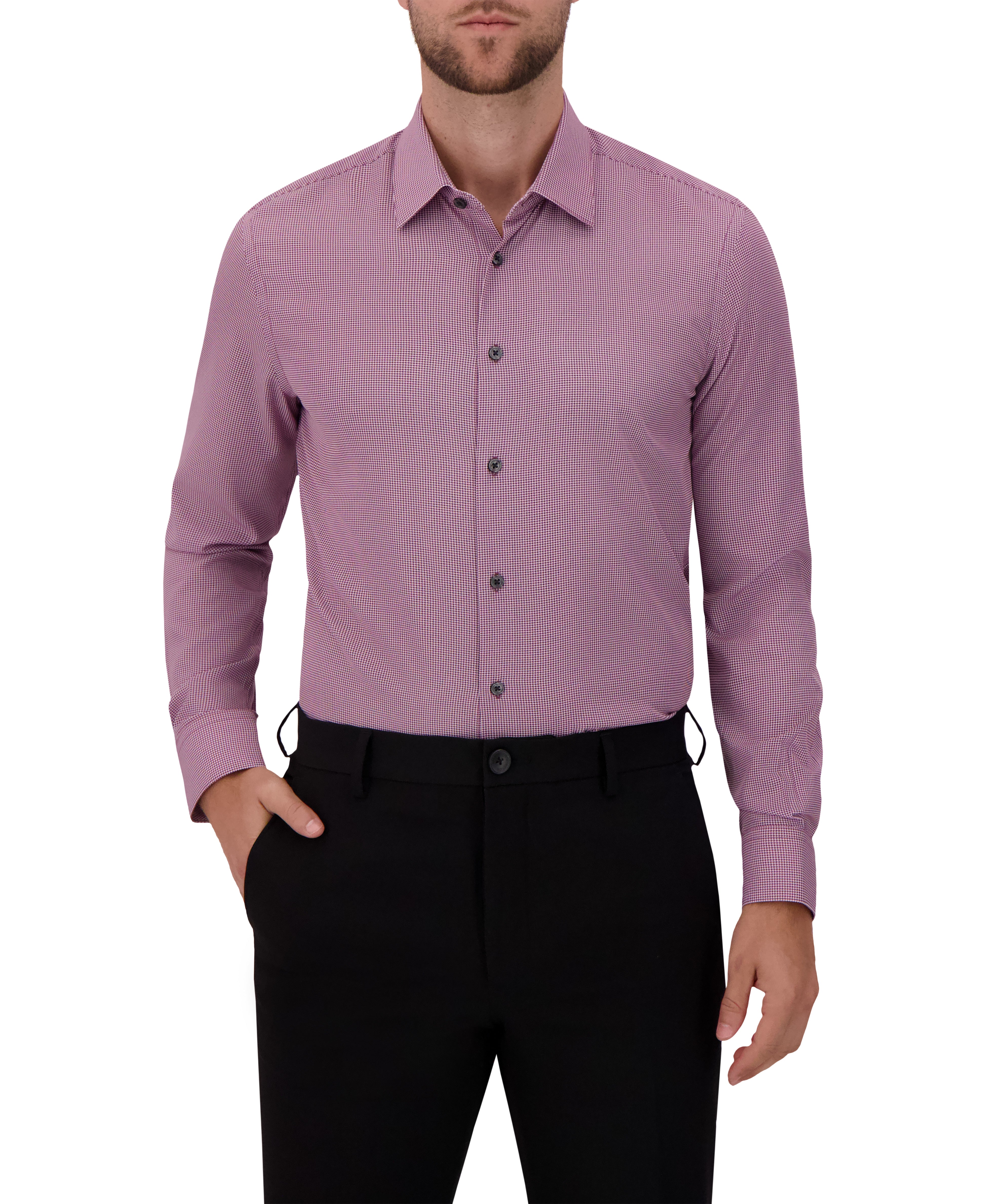 This men’s long sleeve dress shirt features a refined houndstooth micro-print that delivers classic style with a contemporary edge. Designed with a pointed collar, long sleeves with buttoned cuffs, and a clean button-front closure, it offers a sharp, professional silhouette ideal for work or formal occasions. Crafted from a 4-way stretch woven fabric, it provides all-day comfort, flexibility, and ease of movement while maintaining a smooth, structured appearance. The modern fit ensures a tailored look whether worn tucked in or out.