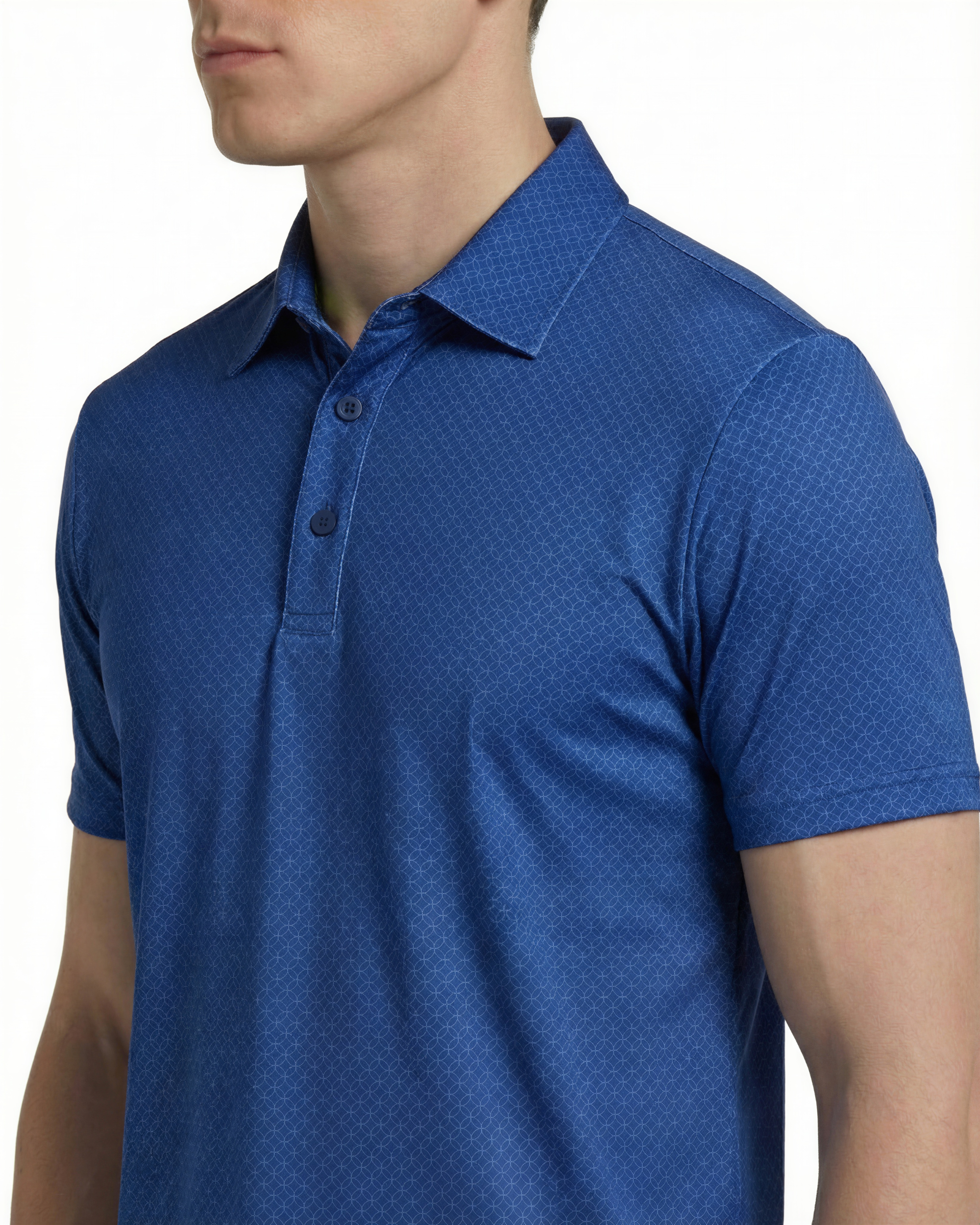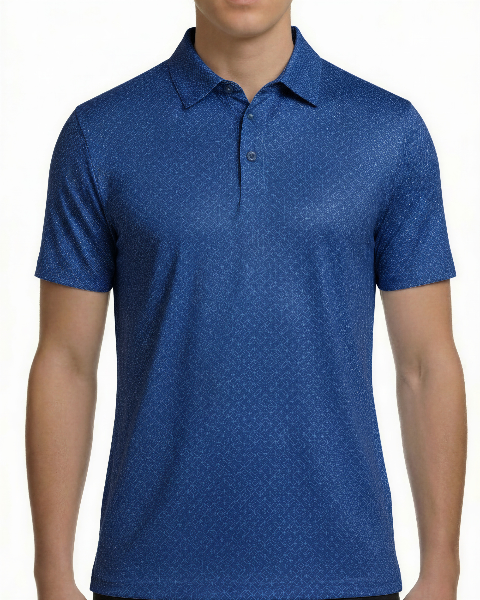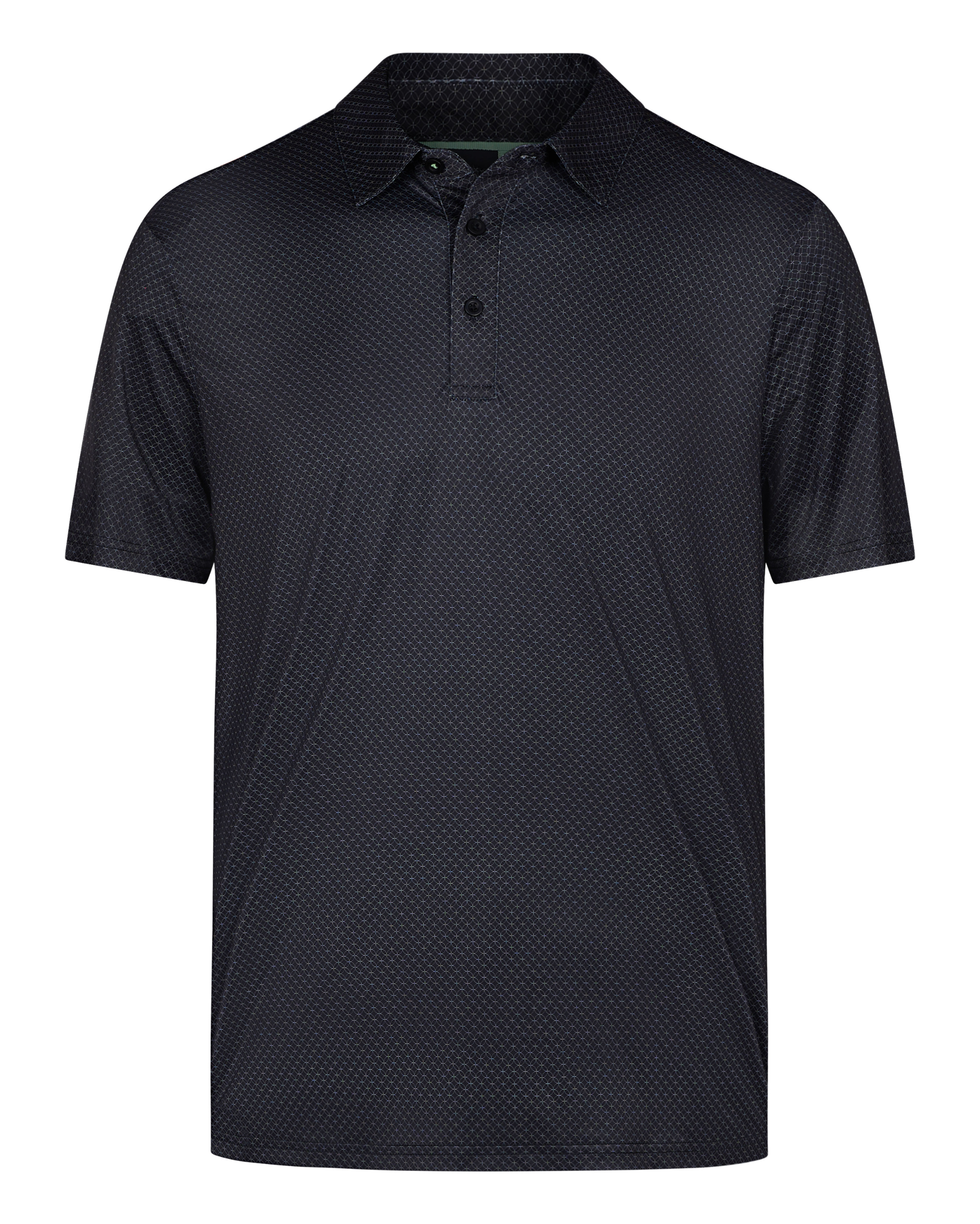 This men’s golf polo shirt features an all-over micro geometric pattern across the surface, combined with a structured collar and short sleeve construction. The design includes a three-button placket and a straight hem for a clean, consistent silhouette. Made from a polyester-spandex blend, the knit fabric provides stretch and maintains shape during repeated use.