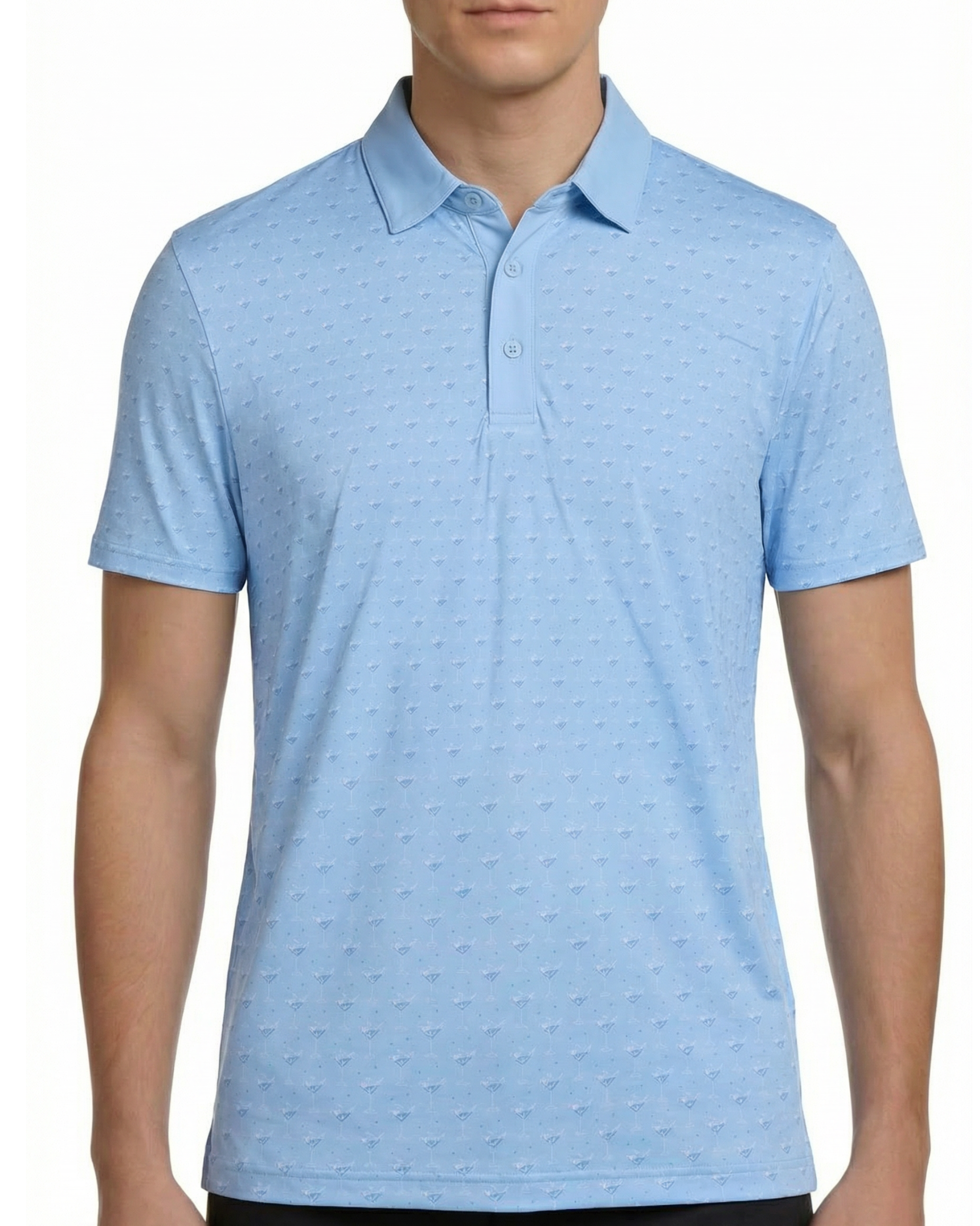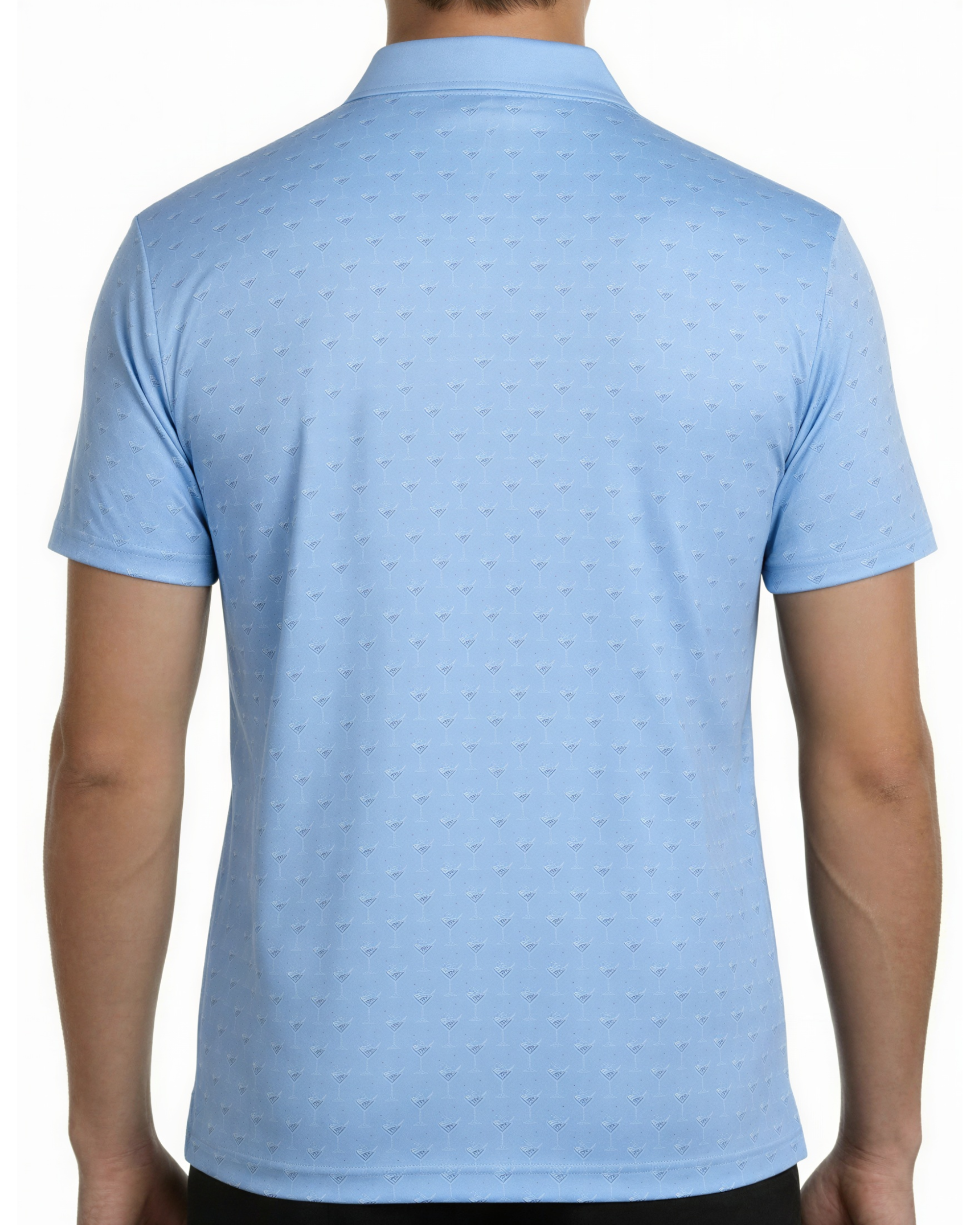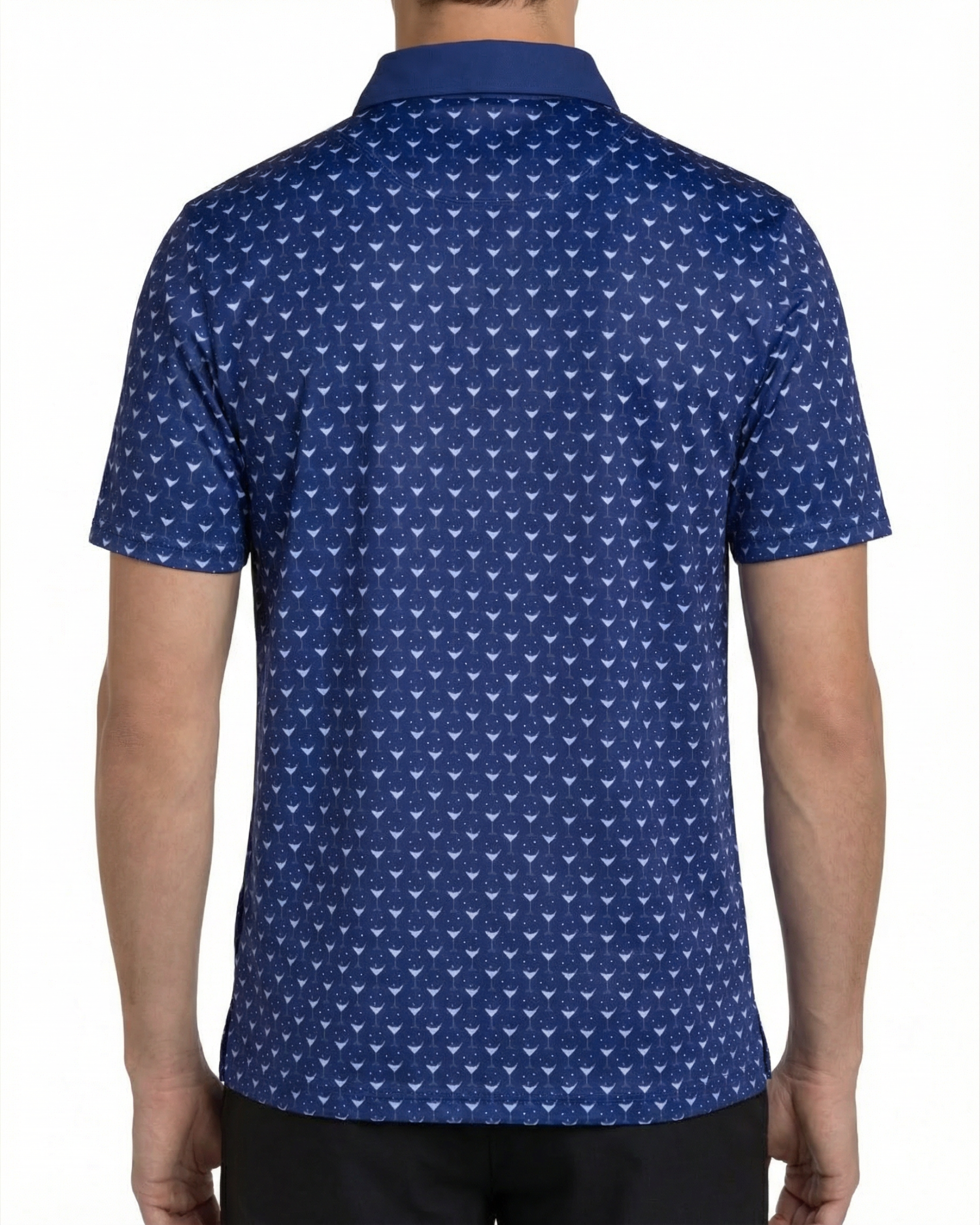 This men’s golf polo shirt features an all-over martini glass pattern printed on a smooth knit surface with a structured collar and short sleeves. It includes a three-button placket and a straight hem, providing a consistent and structured construction. The polyester-spandex fabric composition allows stretch and maintains the shape of the garment.