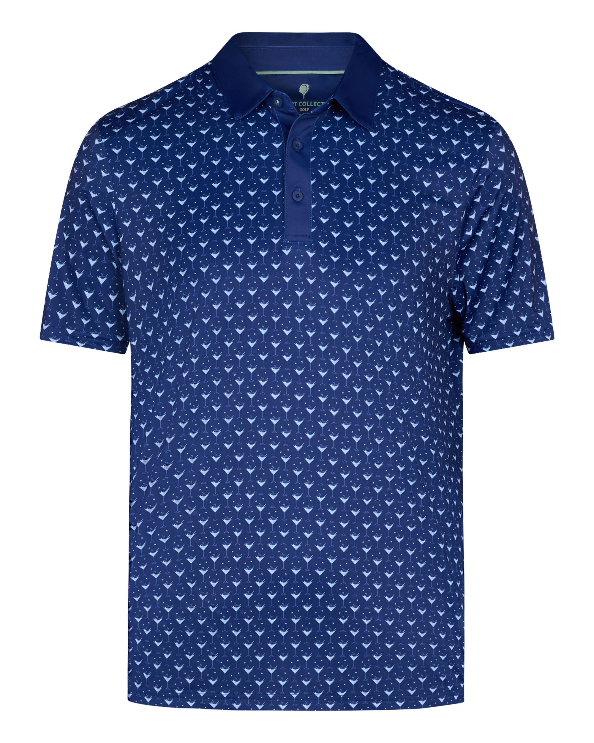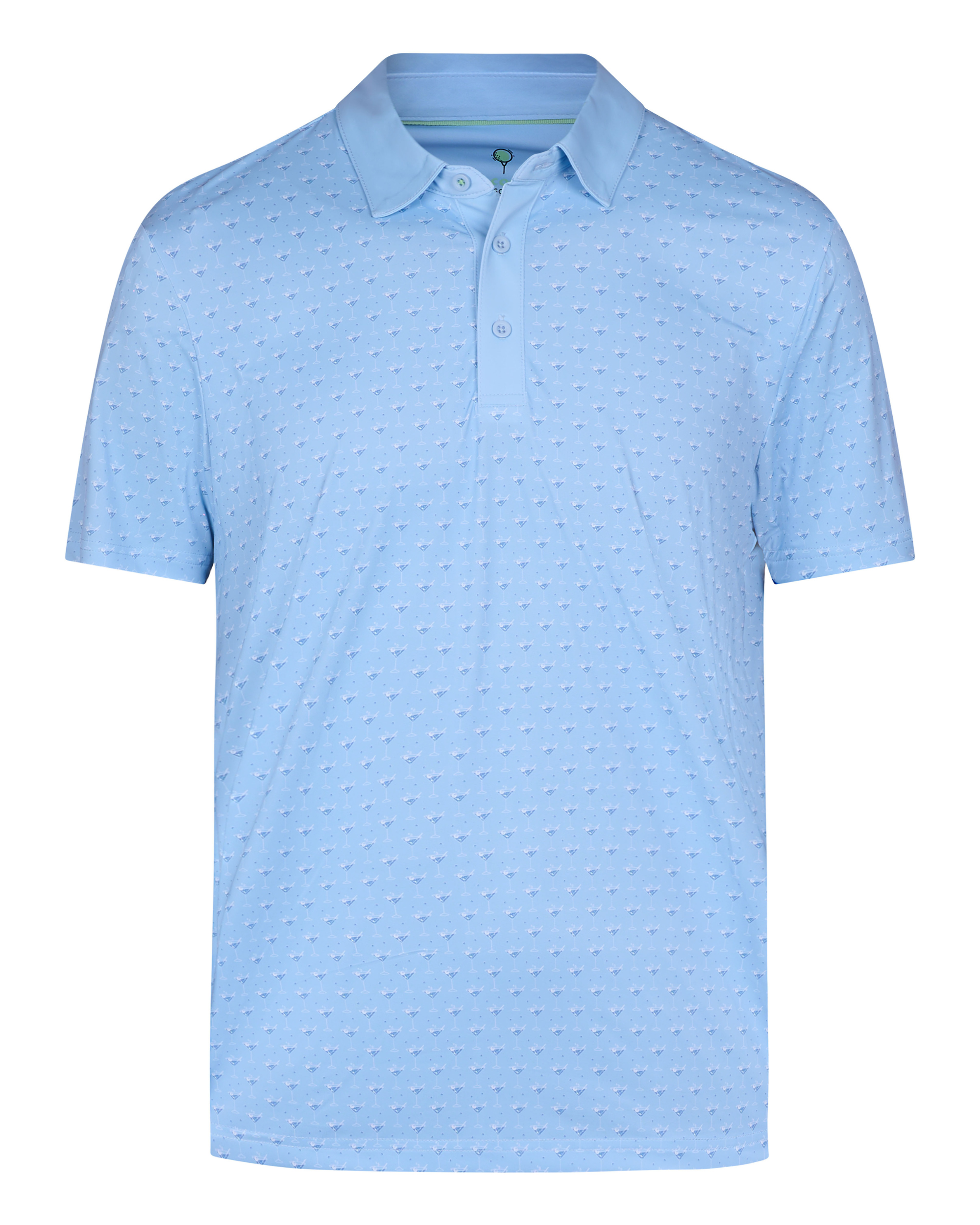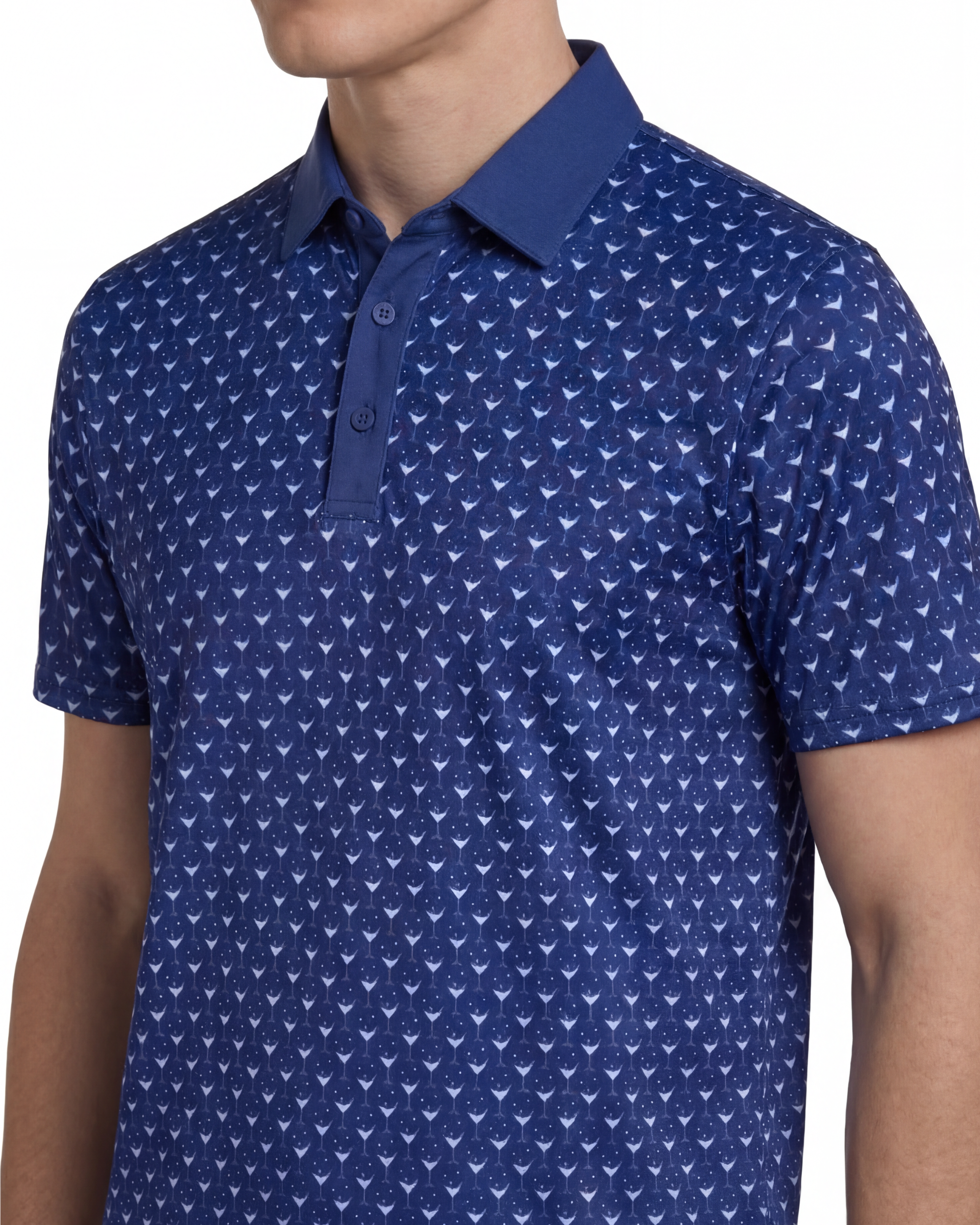 This men’s golf polo shirt features an all-over martini glass pattern printed on a smooth knit surface with a structured collar and short sleeves. It includes a three-button placket and a straight hem, providing a consistent and structured construction. The polyester-spandex fabric composition allows stretch and maintains the shape of the garment.
