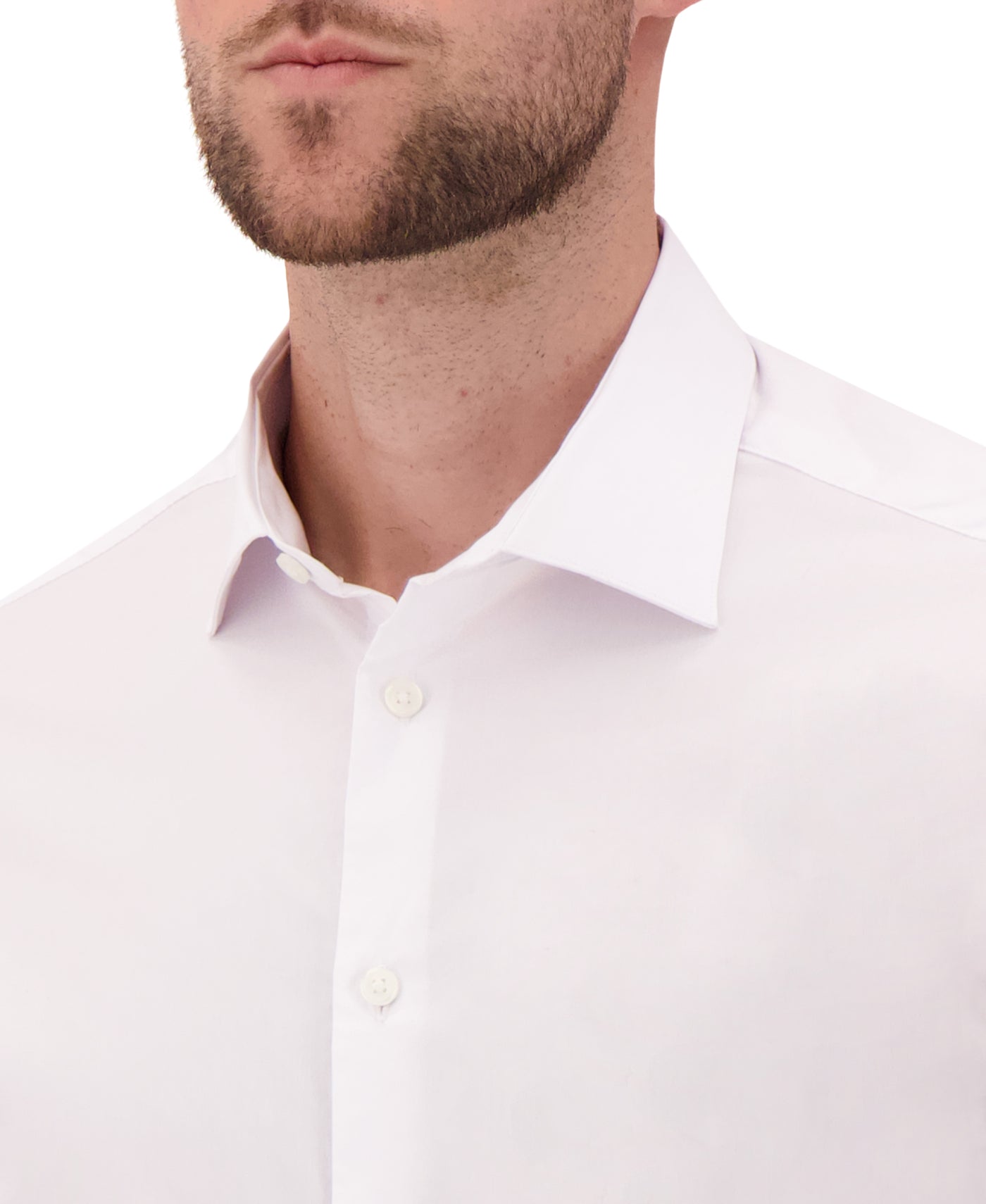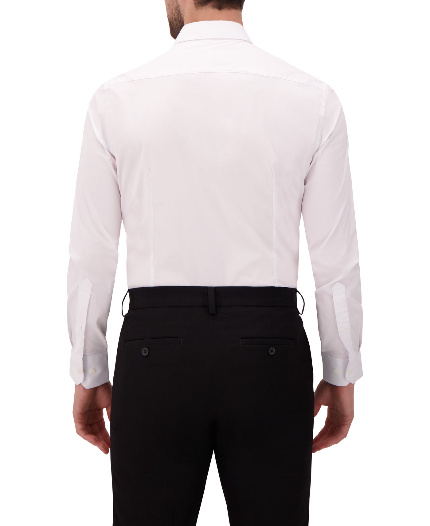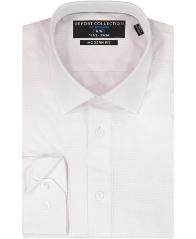 This men’s long sleeve dress shirt features a refined tonal geometric micro-pattern woven into a crisp white base for a clean, elevated appearance. Designed with a pointed collar, long sleeves with buttoned cuffs, and a full button-front closure, it delivers a sharp, professional silhouette ideal for business, formal occasions, or elevated everyday wear. Crafted from a 4-way stretch woven fabric, it offers enhanced flexibility and comfort while maintaining structure throughout the day. The modern fit provides a tailored look whether worn tucked in or styled casually.