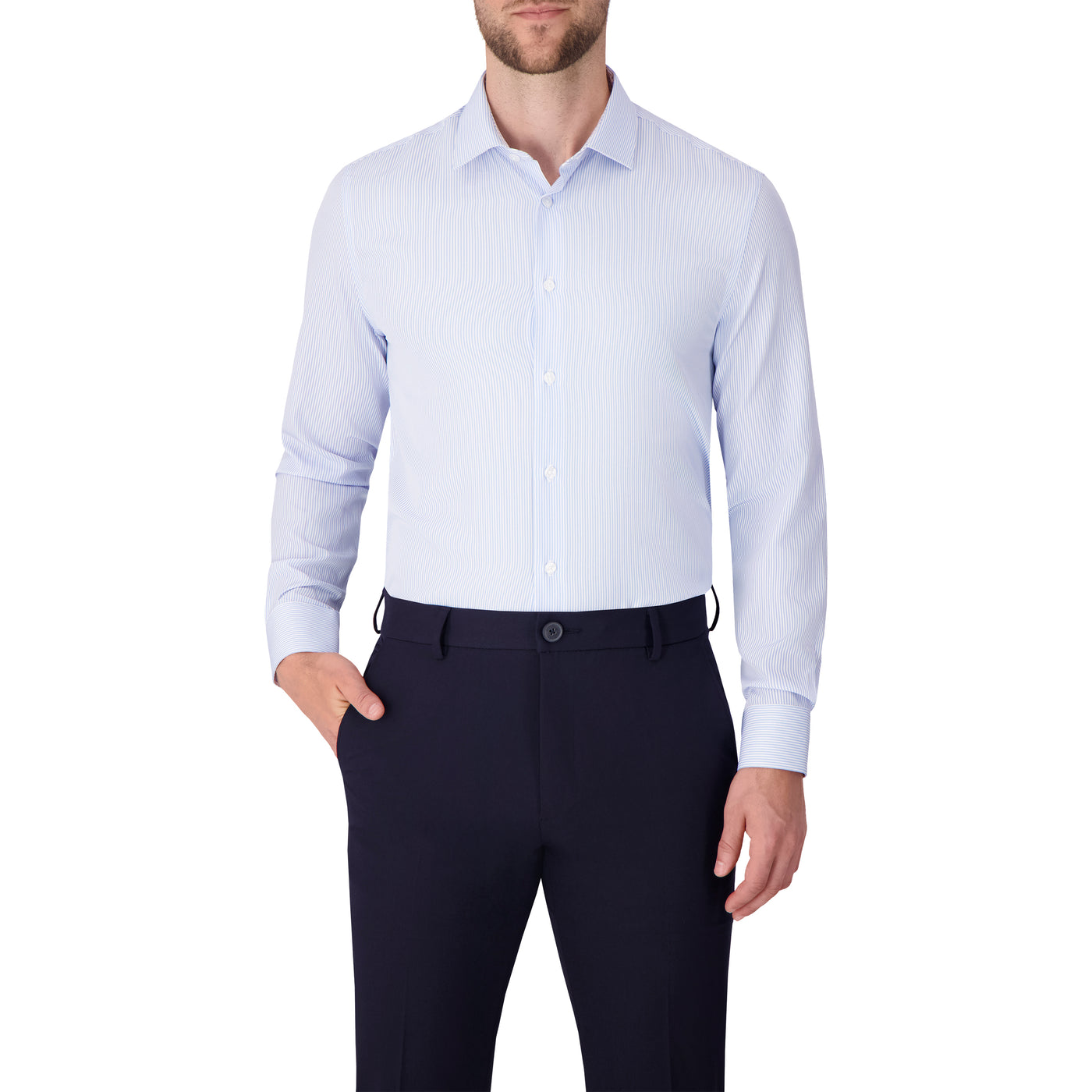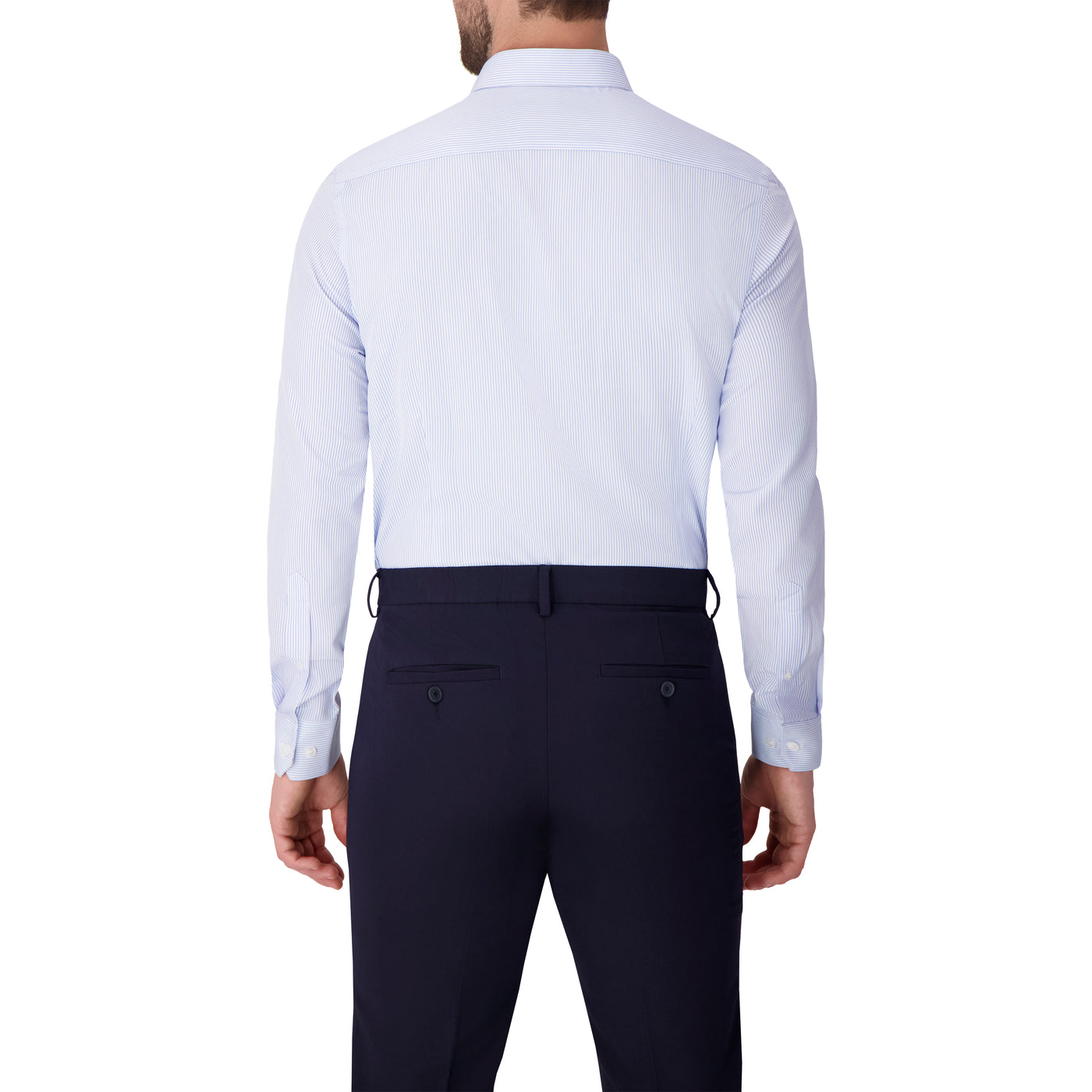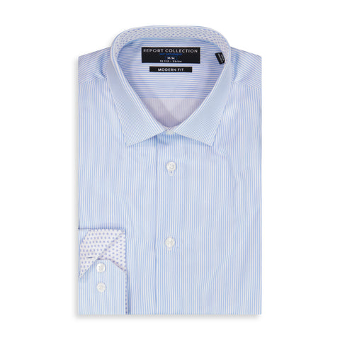This men’s dress shirt features a narrow light blue stripe pattern across the white surface for a clean, linear look. It includes a pointed collar, long sleeves with buttoned cuffs, and a full button-front placket with light-colored buttons. The woven poly-spandex blend shows a smooth appearance, and the inner collar and cuffs include a contrasting printed detail.