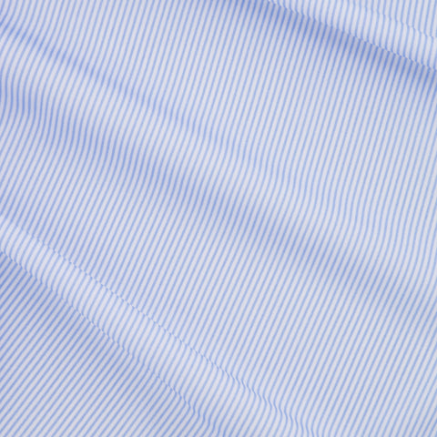 Stripe Pattern: Narrow vertical light blue stripes across the shirt