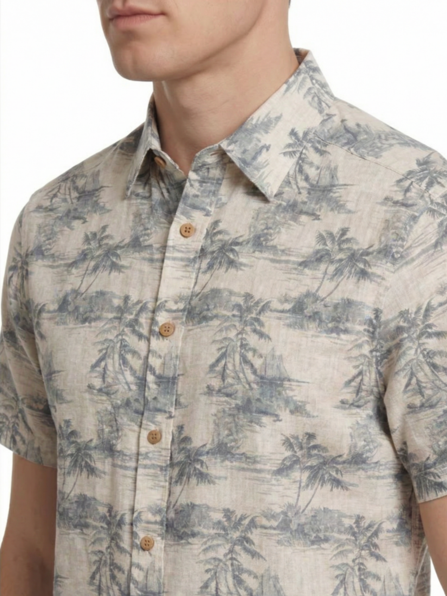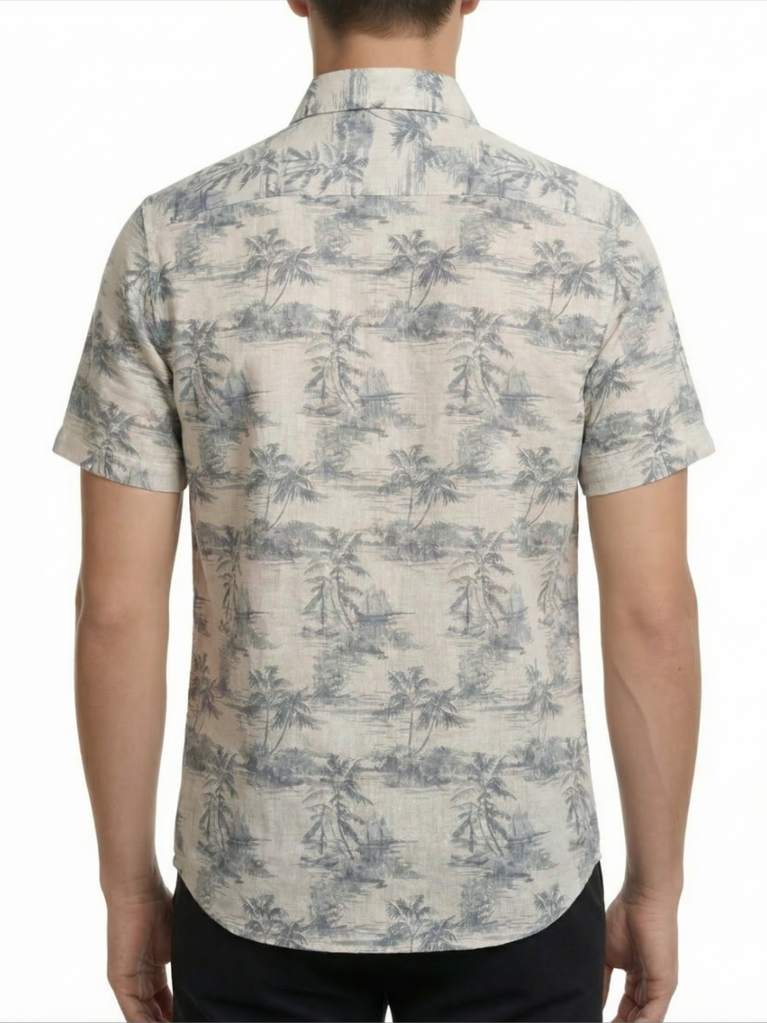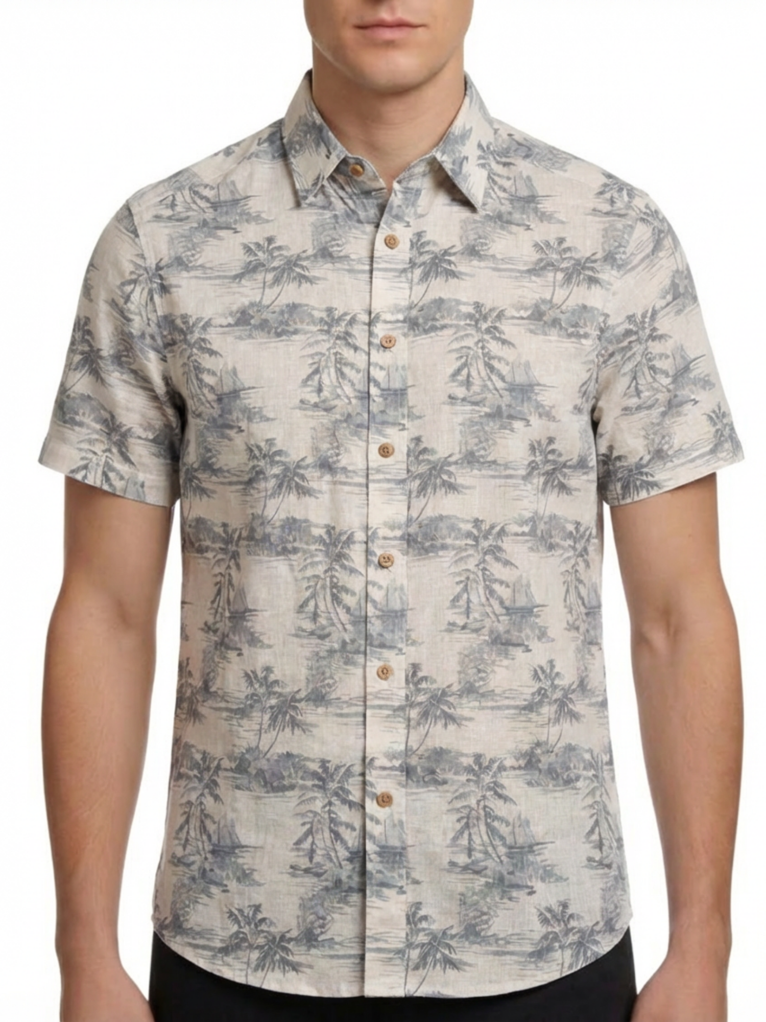 This men’s short-sleeve sport shirt features an all-over beach landscape print on a yarn-dyed linen and cotton woven fabric. The design includes palm trees, shoreline scenery, and ocean-inspired elements. It is constructed with a point collar, full button-front closure, short sleeves, and a curved hem. The linen and cotton blend offers a lightweight woven structure with breathable comfort suitable for warm-weather wear.