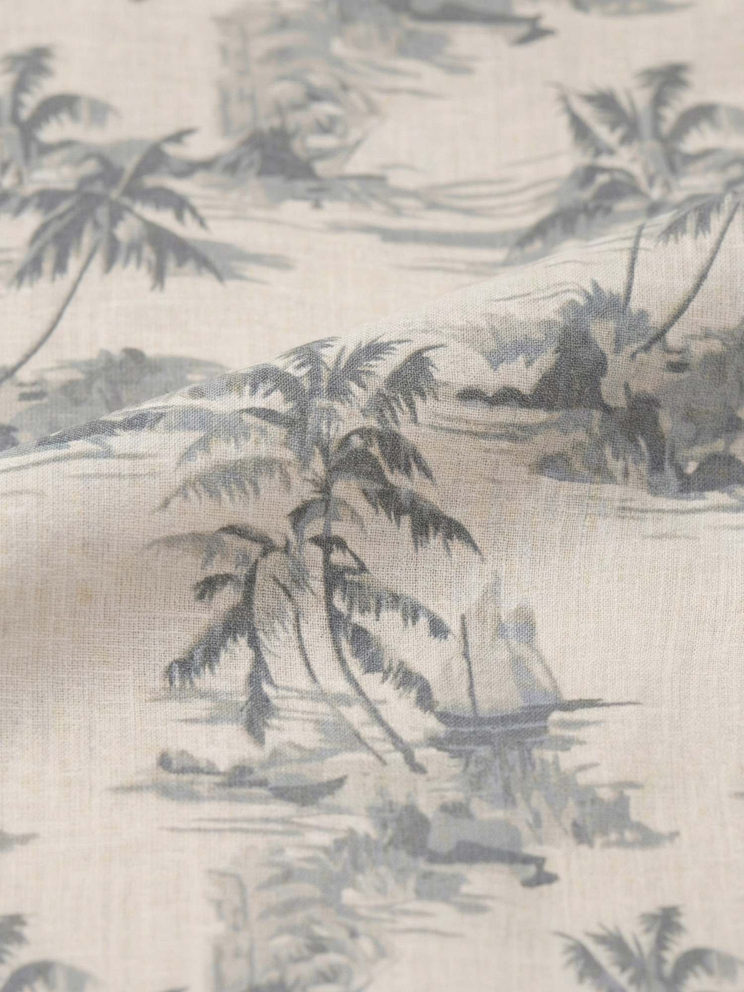 - Beach Landscape Print: All-over coastal scenery design with palm trees and shoreline elements