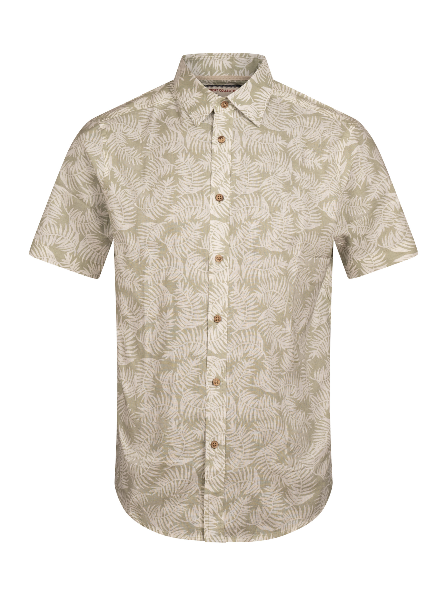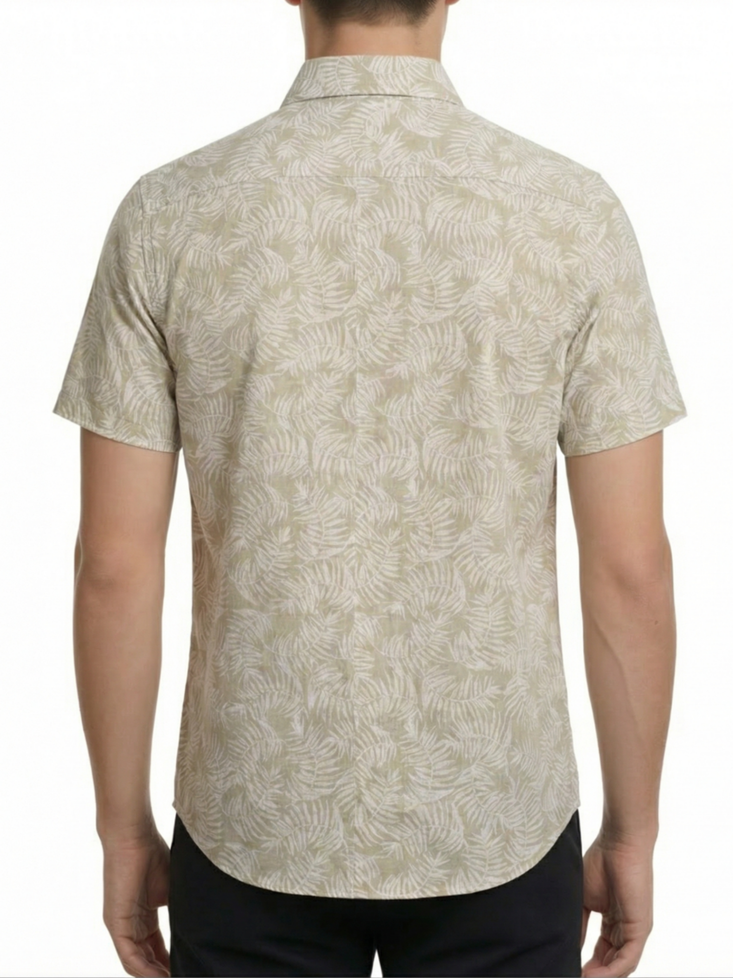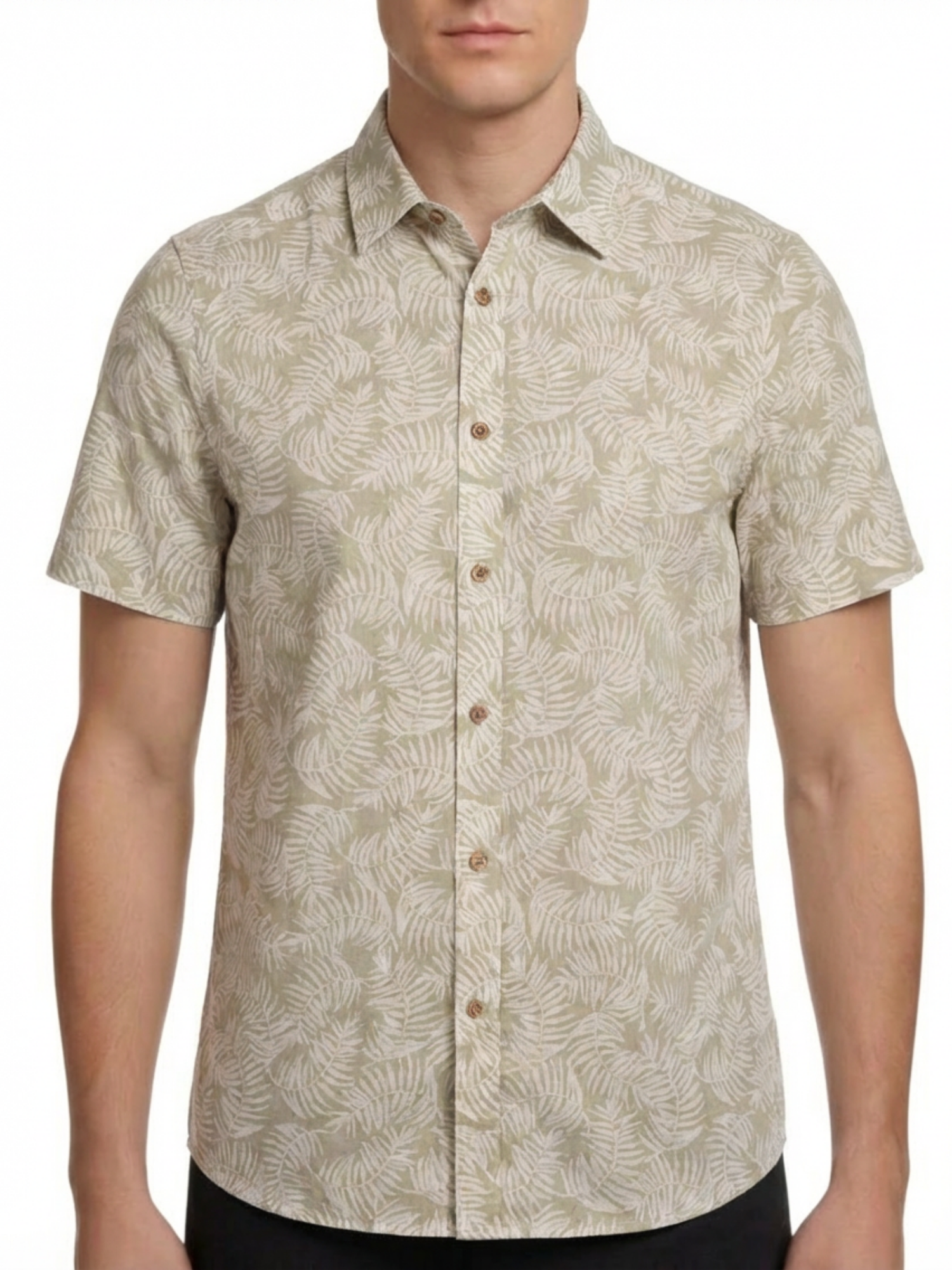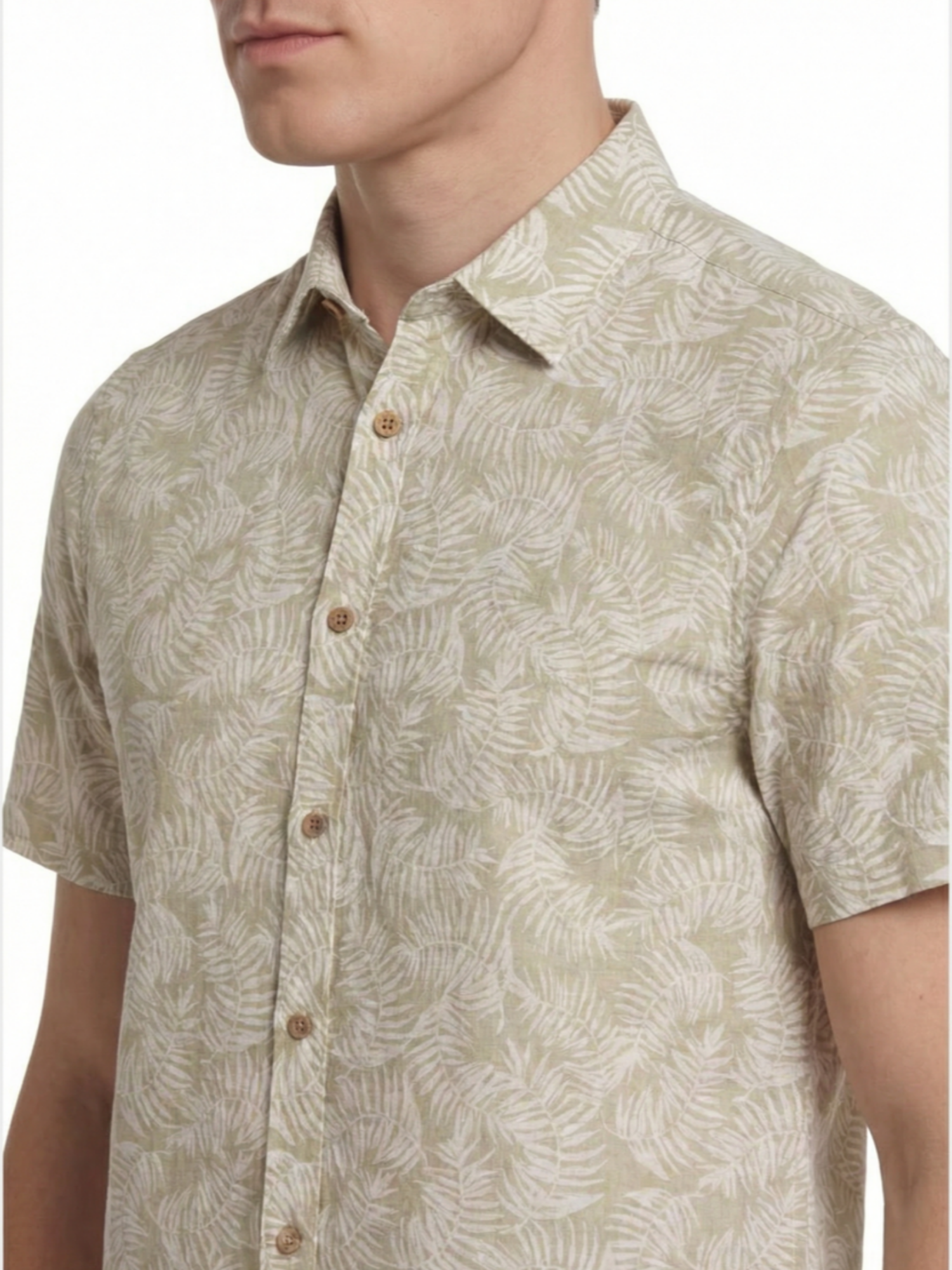 This men’s short-sleeve sport shirt features a palm leaf print pattern on a yarn-dyed linen and cotton woven fabric. It includes a point collar, full button-front closure, short sleeves, and a curved hem. The linen and cotton blend provides a lightweight woven structure with a breathable hand feel suitable for warm-weather wear.