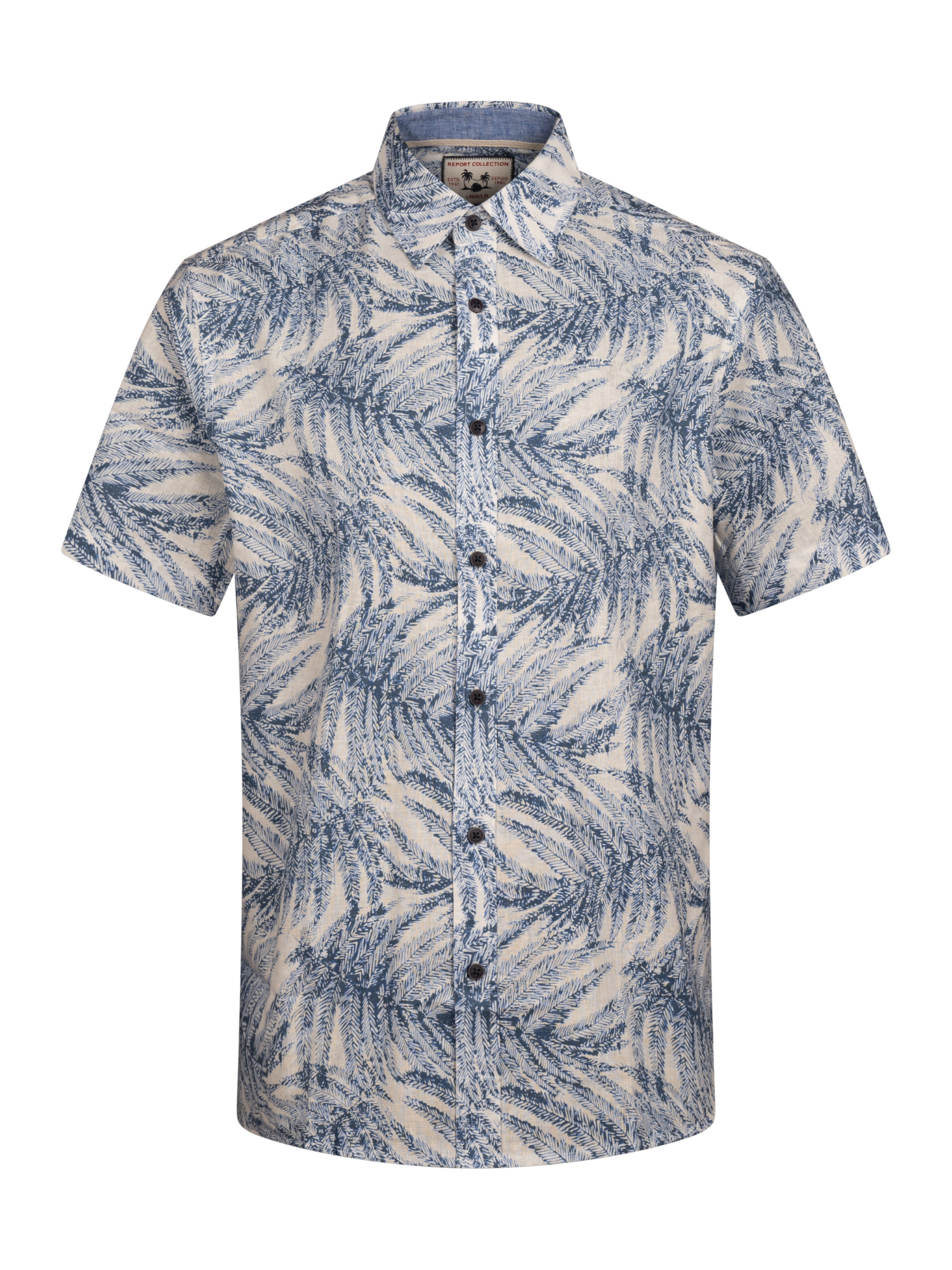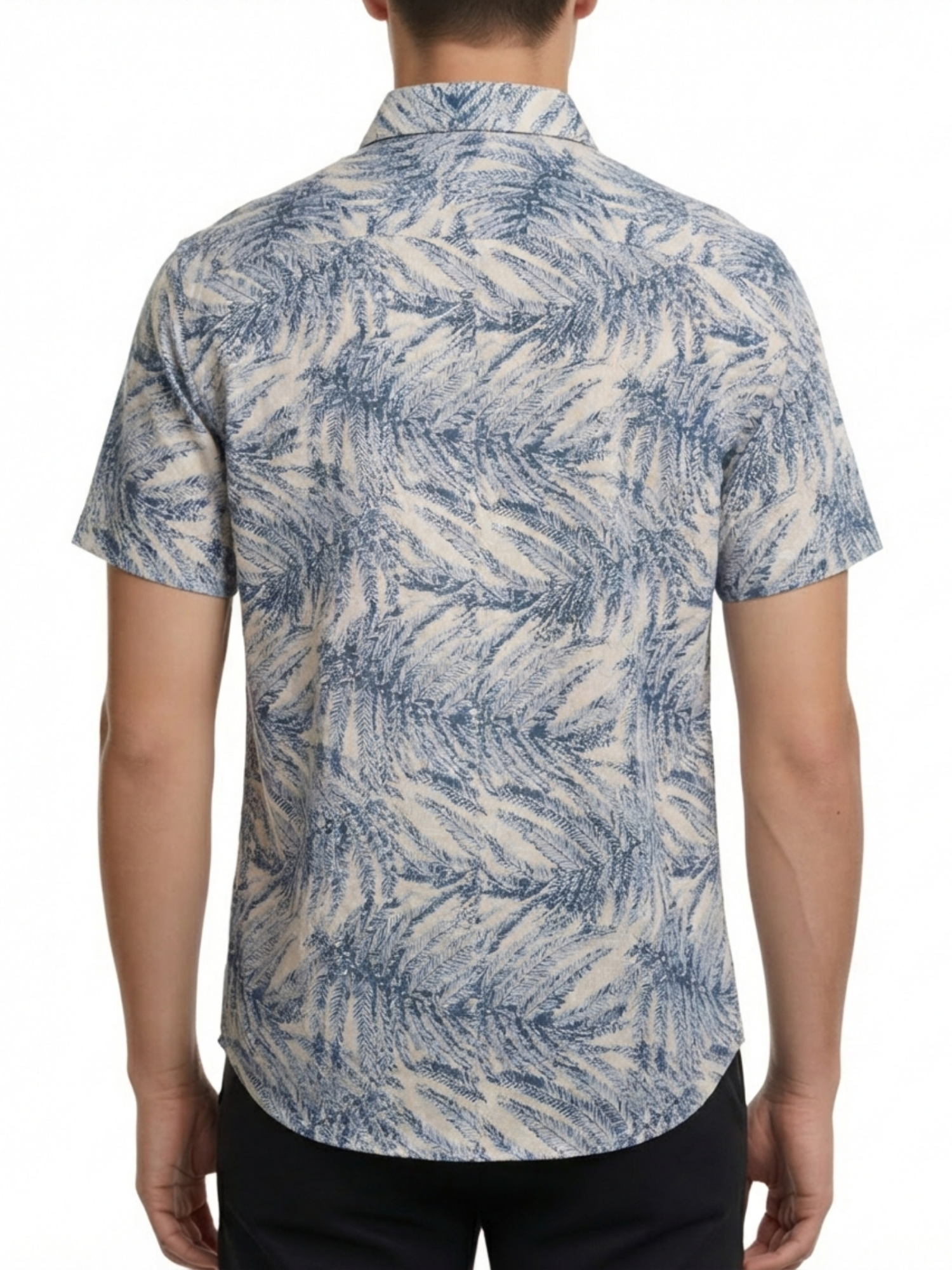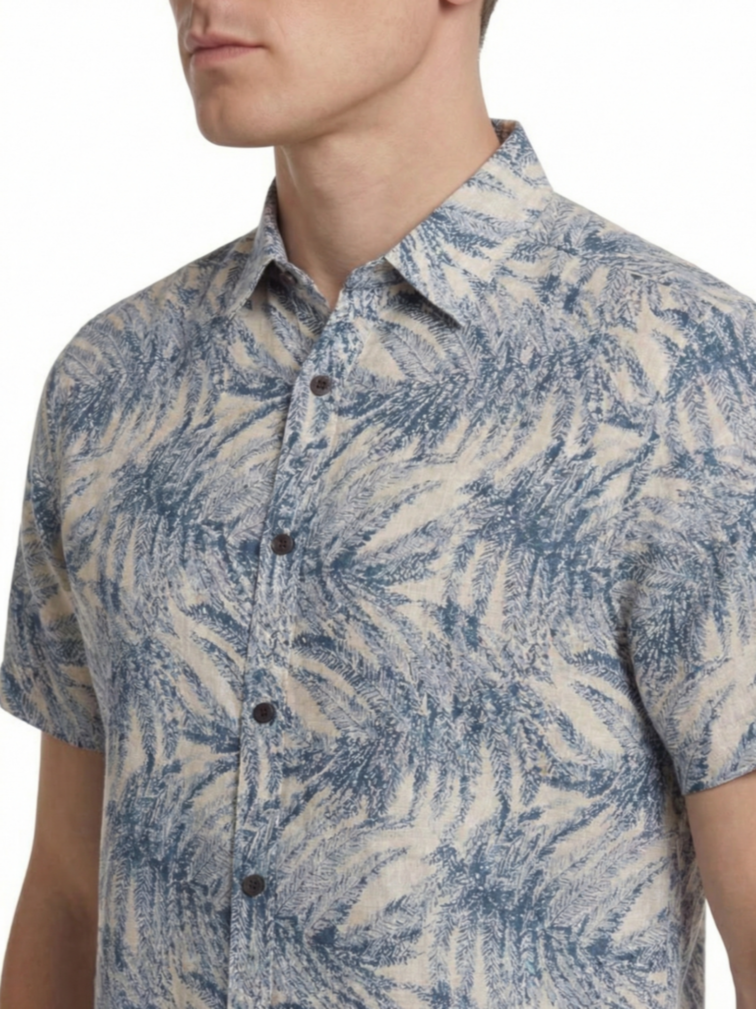 This men’s short-sleeve sport shirt features an all-over tropical leaf print on a woven linen–cotton fabric. It includes a full button-front closure, short sleeves, a structured point collar, and a curved hem. The linen–cotton blend provides a breathable woven structure with a visible natural texture.