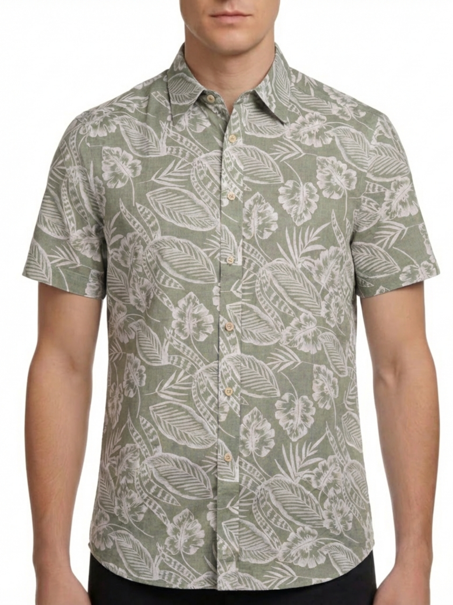 This men’s short-sleeve sport shirt features a tropical print pattern on a yarn-dyed linen and cotton woven fabric. It includes a point collar, full button-front closure, short sleeves, and a curved hem. The linen and cotton blend provides a lightweight woven structure with a breathable hand feel suitable for warm-weather wear.