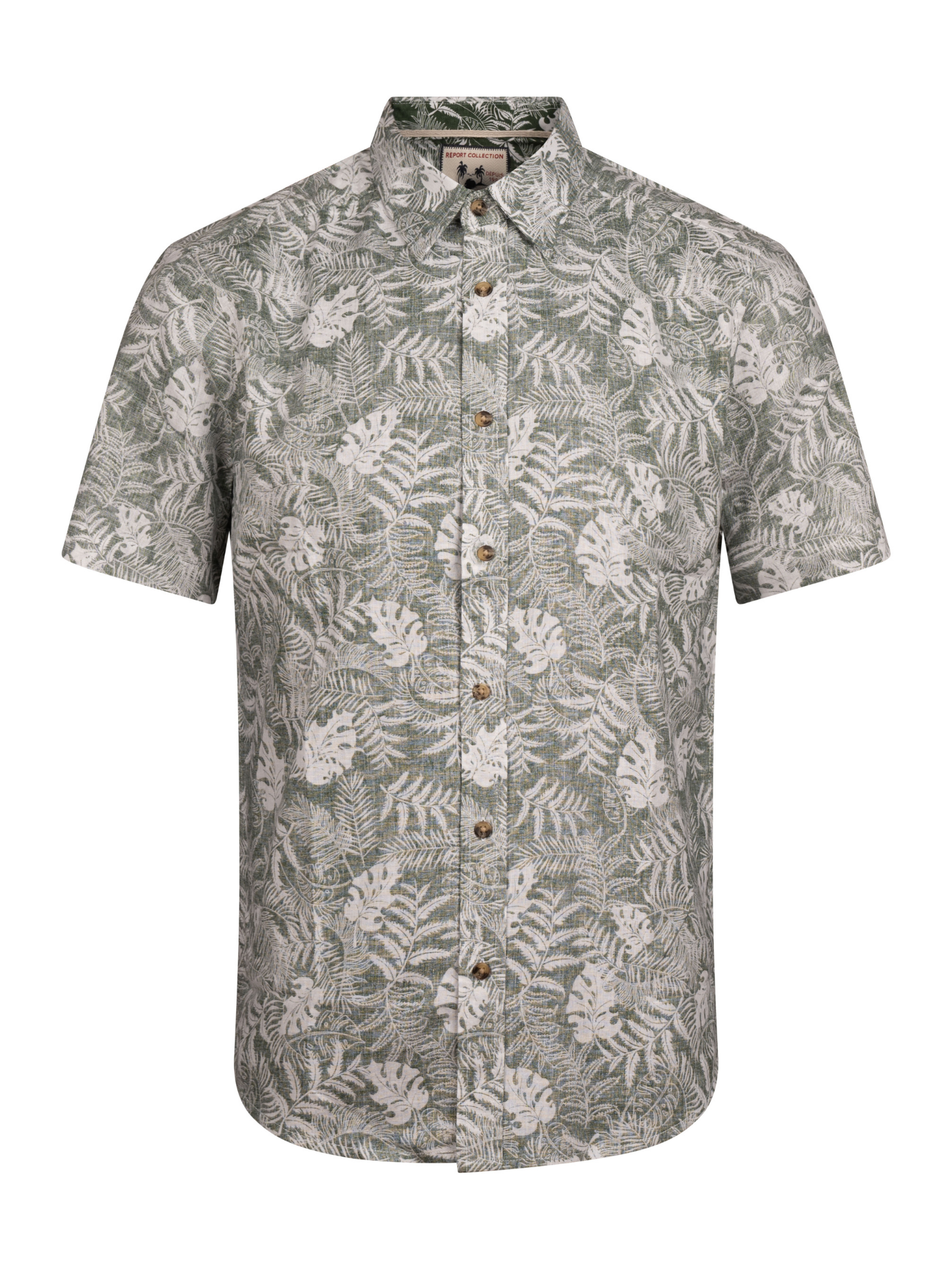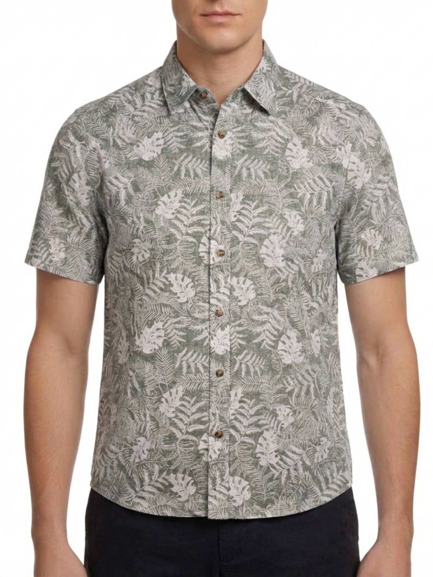 This men’s short sleeve sport shirt features an all-over tropical leaf print on a yarn-dyed linen and cotton woven fabric. The botanical design combines various tropical foliage elements in a layered pattern. It is constructed with a point collar, full button-front closure, short sleeves, and a curved hem. The linen and cotton blend provides a lightweight woven structure with breathable comfort suitable for warm-weather wear.