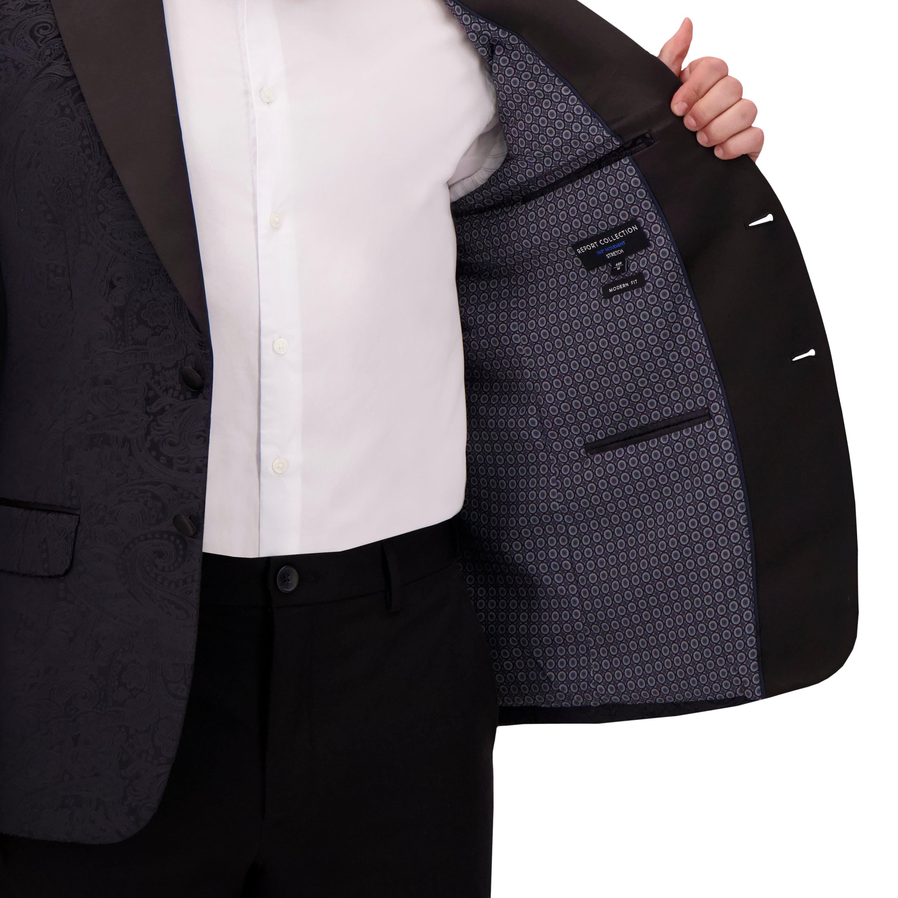 This men’s knit blazer features an all-over tonal paisley texture that adds depth while maintaining a formal appearance. Designed with a classic single-breasted silhouette, it includes a notch lapel, structured shoulders, and a clean two-button front closure. The fully lined interior provides a smooth layering experience, while the tailored cut delivers a polished profile suitable for formal events, evening occasions, or elevated dress wear. Crafted from durable polyester knit, this blazer balances structure, comfort, and visual detail.